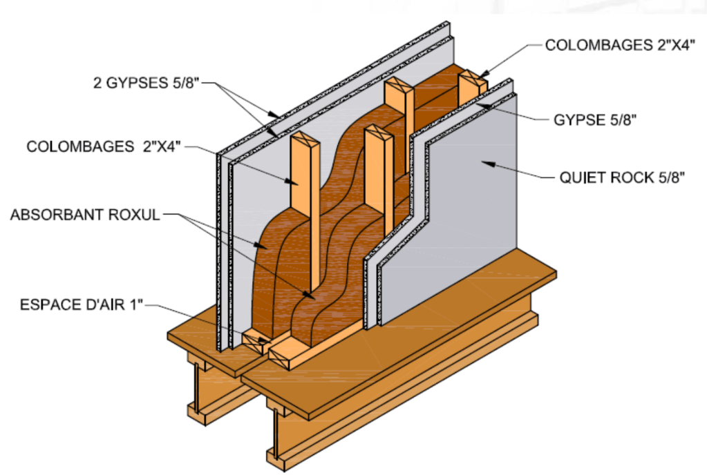 Les matériaux absorbants sont conçus pour absorber le son plutôt que de le réfléchir. Les matériaux comme la laine de roche, la mousse acoustique et les panneaux perforés sont couramment utilisés pour réduire la réverbération et améliorer la qualité sonore à l’intérieur des espaces en absorbant une partie du son incident. Théoriquement, si l’on regarde dans le Code National du Bâtiment, les différentes compositions suggérées ne précise quel type d’insolant utilisé.
