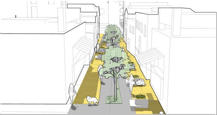 La ruelle, traditionnellement un espace dédié aux services ou souvent négligé dans les plans urbains, est ici métamorphosée en un couloir verdoyant. Les voies pour les véhicules sont remplacées par des chemins piétonniers pavés, encadrés par des rangées d’arbres matures et de la végétation dense. Ce design non seulement embellit l’espace mais joue aussi un rôle crucial dans l’amélioration de la qualité de l’air et dans la réduction des îlots de chaleur urbains, fréquents dans les zones densément bâties.
