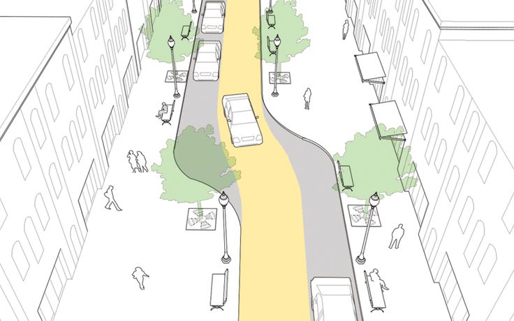 La rue est divisée en deux parties principales : une voie centrale pavée pour les véhicules et un chemin sinueux pour les piétons et les cyclistes, peint en jaune vif. Cette séparation visuelle non seulement structure l’espace mais encourage également une cohabitation sécuritaire entre les différents usagers. La voie pour les véhicules est suffisamment étroite pour ralentir le trafic, ce qui réduit le risque d’accidents et augmente la sécurité pour tous.