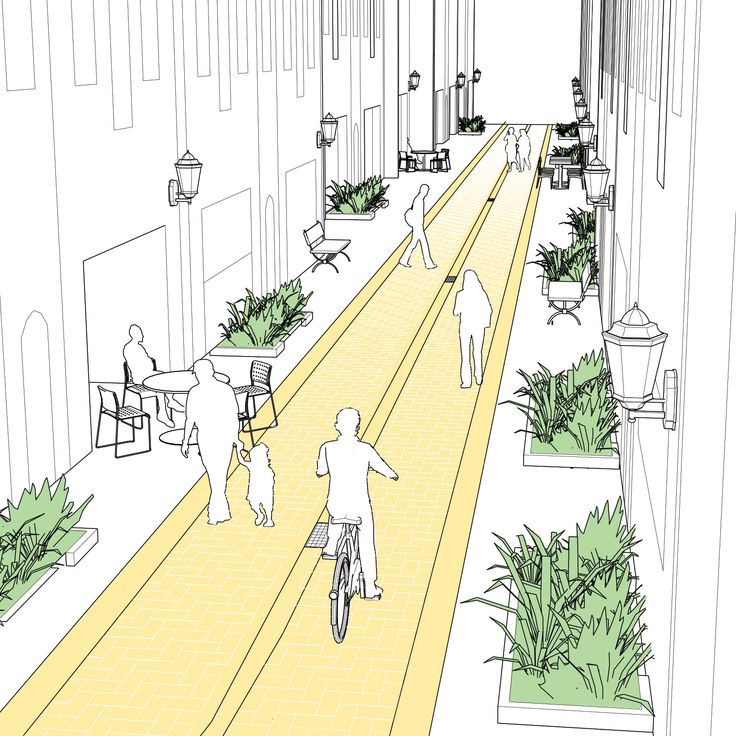 Cette illustration met en scène un passage urbain piétonnier, aménagé pour favoriser la marche et le cyclisme dans un cadre à la fois fonctionnel et esthétique. Le design de cette zone piétonne montre comment les espaces urbains peuvent être transformés pour améliorer la qualité de vie des citadins.