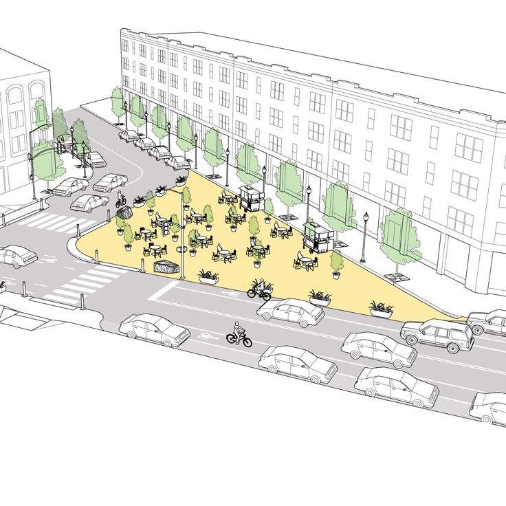 Au centre de l’image, on observe un grand espace jaune où plusieurs bancs, tables, et chaises sont disposés, créant un environnement accueillant pour la détente et la socialisation. Cette zone piétonne est entourée de plantes et d’arbres, offrant non seulement un espace ombragé et agréable mais aussi un élément essentiel de verdure qui améliore la qualité de l’air et contribue à la beauté esthétique de l’environnement urbain.