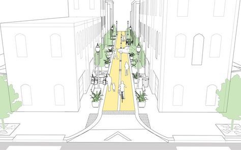 Le chemin central, marqué en jaune, sert clairement de corridor dédié aux cyclistes, mais sa conception large et dégagée suggère également qu’il peut être utilisé par les piétons. Cette polyvalence augmente l’efficacité de l’espace partagé tout en réduisant les conflits potentiels entre les différents usagers de la rue.