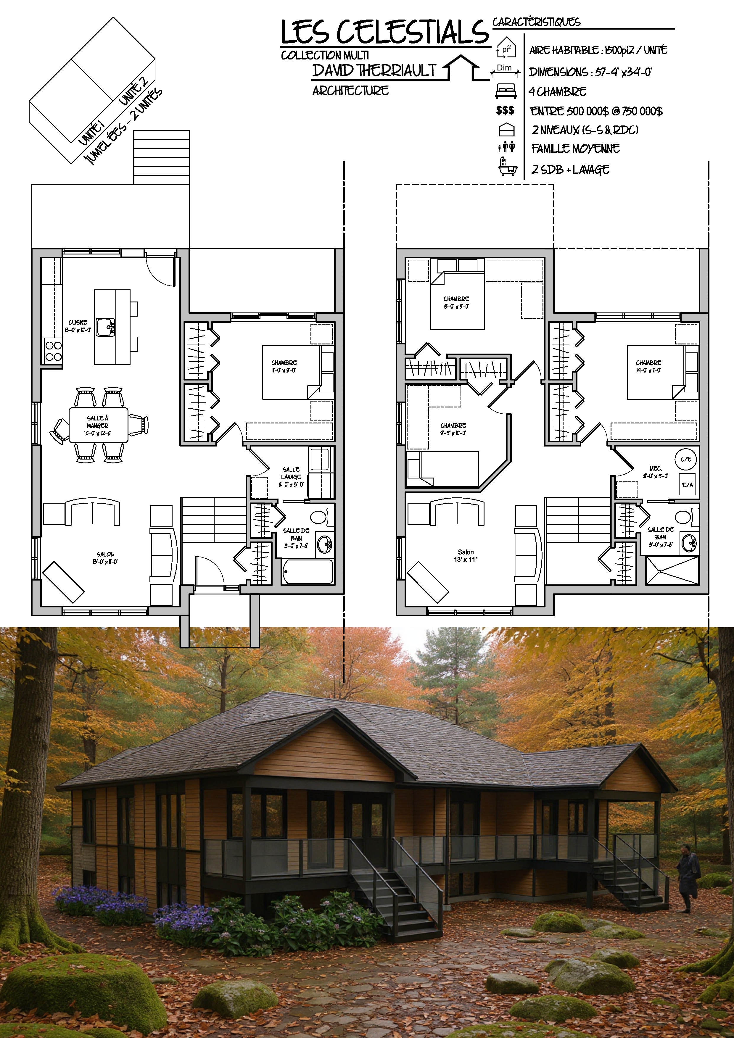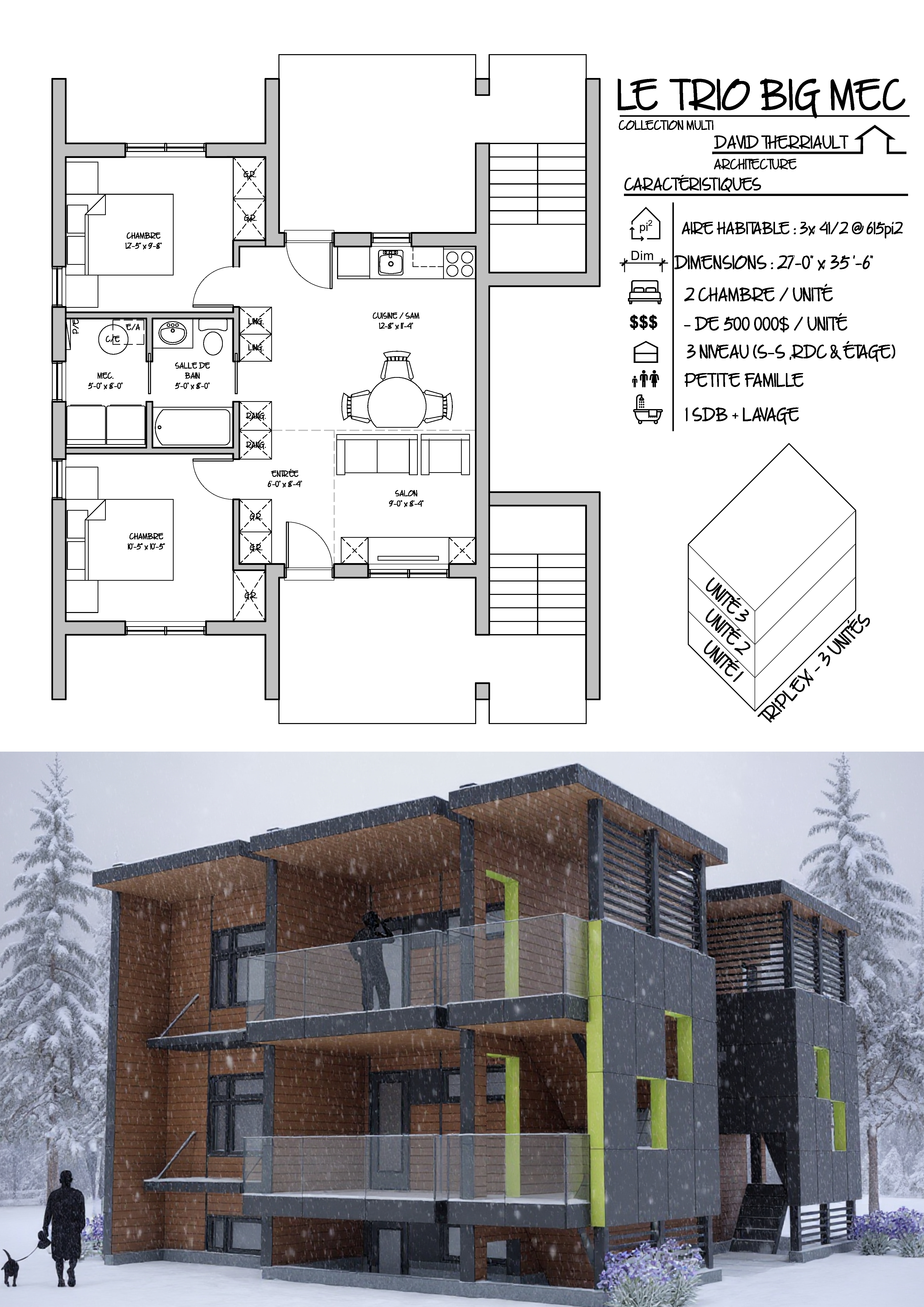 Sur cette page, vous retrouverez une banque de plans de projets de deux (2) logements ou plus. Le terme multi-logements est utilisé pour désigner une habitation comprenant deux (2) unités ou plus d’habitation (jusqu’à 4 unités maximum). On y retrouve, entre autre, des plans de jumelés, de maison bi-générationnelle, de duplex, de triplex et de maisons en rangées. L’ensemble des plans disponibles ne nécessitent pas l’intervention d’un architecte (sous toute réserve) . Pour plus d’information, veuillez vous référer à la section Champ de pratique.